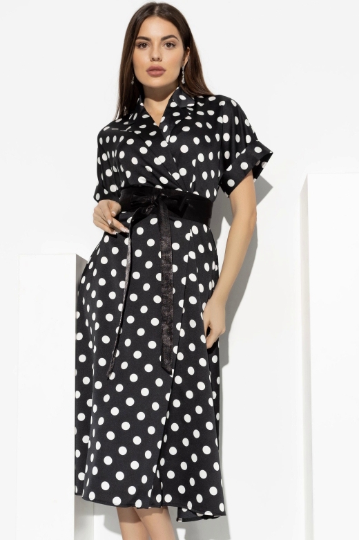 Чёрное платье миди на запах в горох