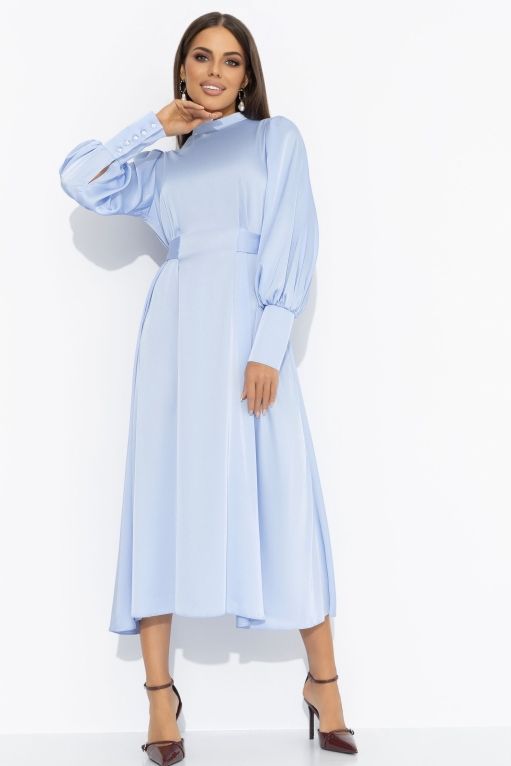 Платье длинное голубого цвета из шёлка от компании Charutti. Модель приталенного силуэта. Струящаяся ткань, юбка-солнце. Широкие манжеты с акцентными пуговицами. В изделие вшит пояс, завязывается на спинке в объемный бант. Прекрасный вариант для торжественного мероприятия.