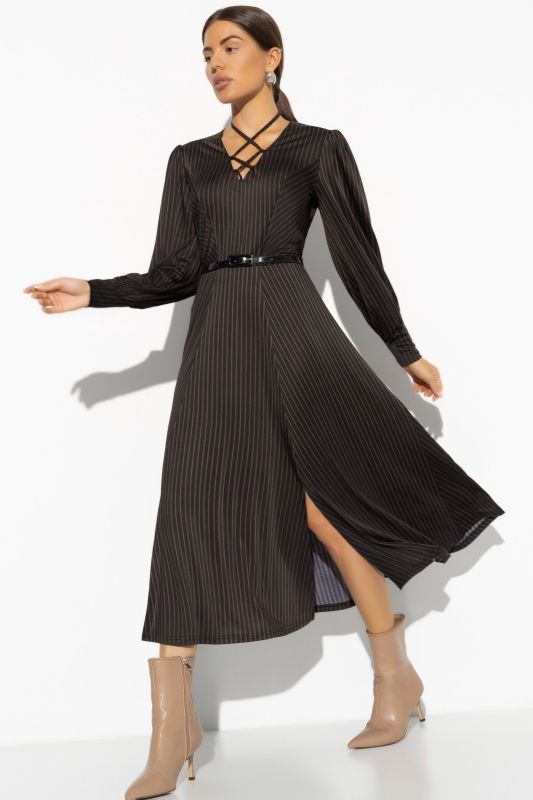 Платье коричневое в полоску с ремешком