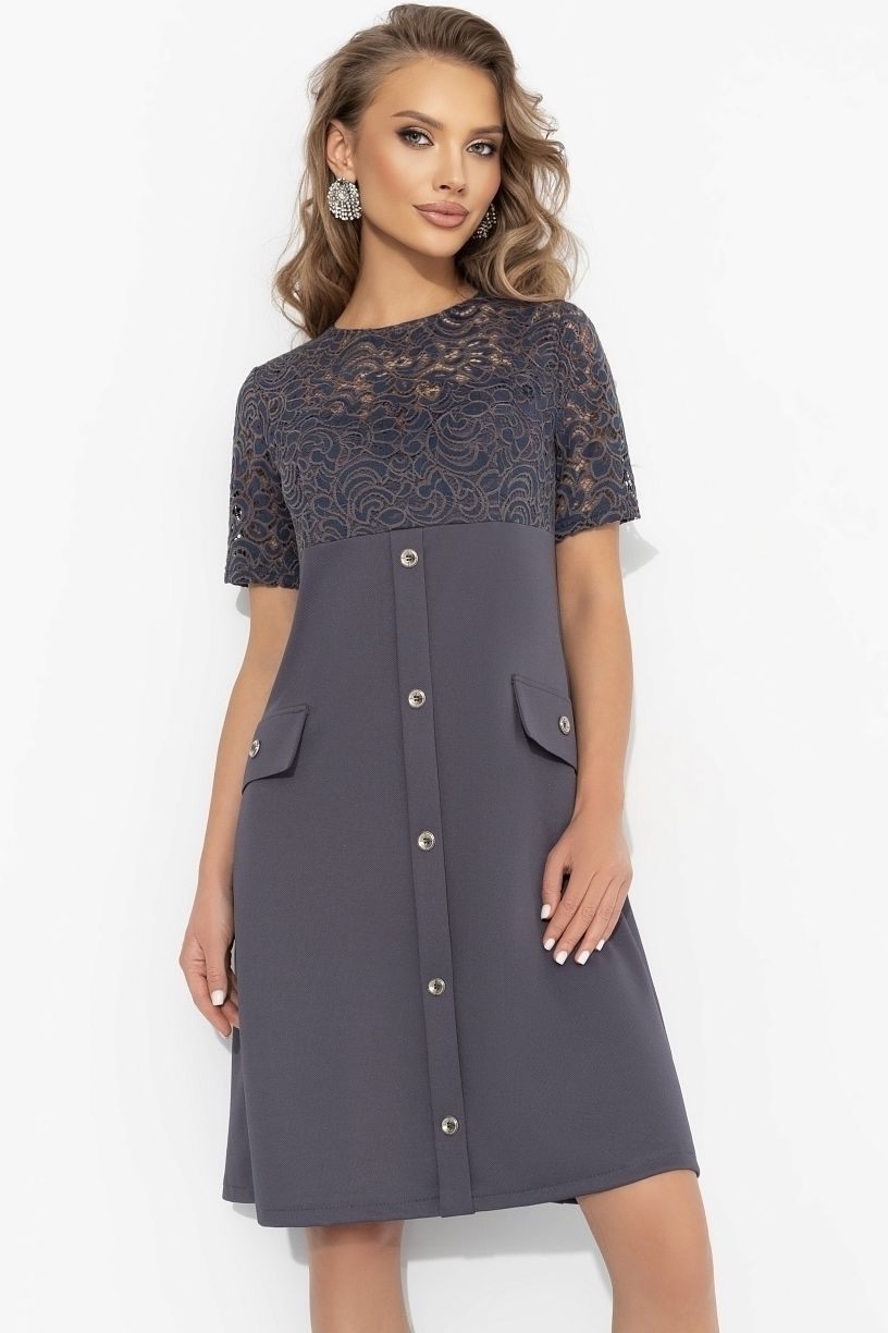 Платье нарядное трикотажное с кружевом от компании Charutti. Модель полуприлегающего силуэта, воротник-стойка с застёжкой на пуговицы по спинке. Втачные короткие рукава. По переду декоративная планка и клапаны с пуговицами. Идеальный выбор для Вашего женственного образа.
