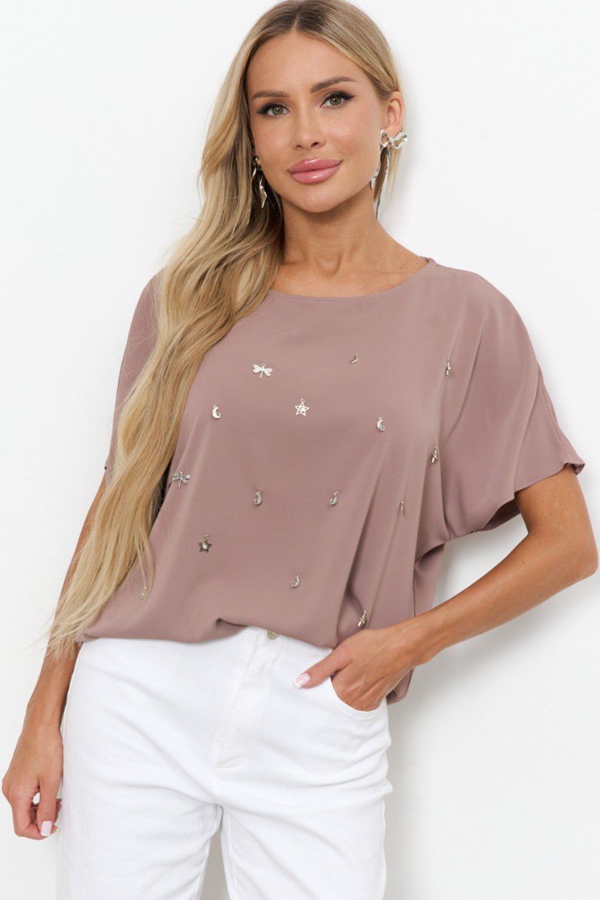 Блузка женская тёмно-бежевого цвета от компании Jetty. Изделие прямого силуэта, выполнено из блузочной ткани. С круглым вырезом горловины и цельнокроеными короткими рукавами. По переду изделия пришиты декоративные элементы. Прекрасный выбор для Вашего повседневного гардероба.