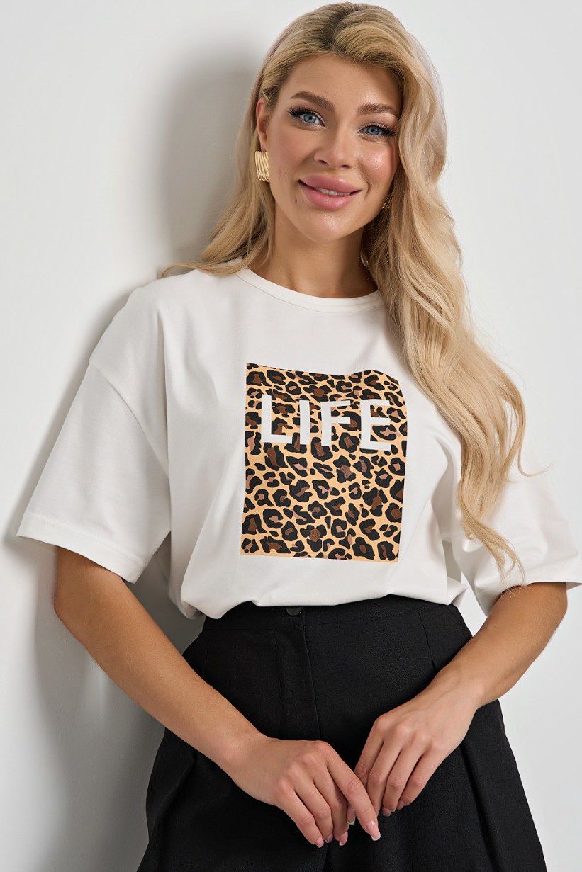 Футболка трикотажная молочного цвета с печатным принтом