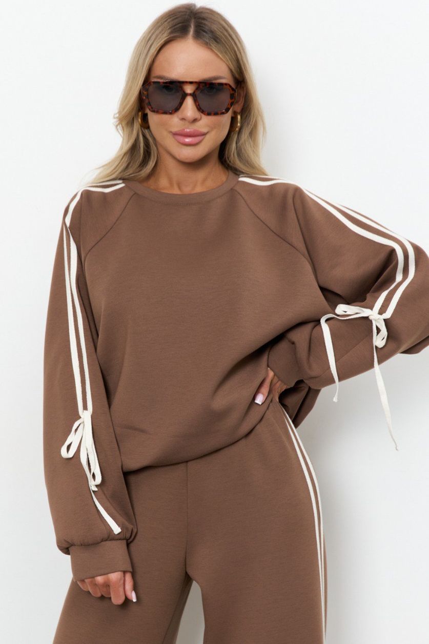 Джемпер трикотажный шоколадного цвета от компании Jetty. Модель свободного силуэта, длинный рукав реглан на манжете. По низу изделия вшита кулиска, что позволяет носить джемпер как свободным, так и собрать его на кулиску. Рукав от горловины декорирован лампасами. Стильный образ для повседневной носки.