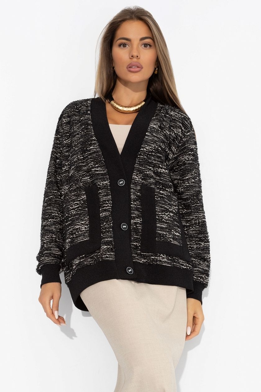 Кардиган чёрный в стиле Шанель от производителя Charutti. Модель свободного силуэта, выполнена из трикотажной ткани "креп" и жаккарда. V-образный вырез горловины. Втачные длинные рукава, со спущенной линией плеча. Застёжка на пуговицы, карманы по переду. Идеальный выбор для создания стильного образа.