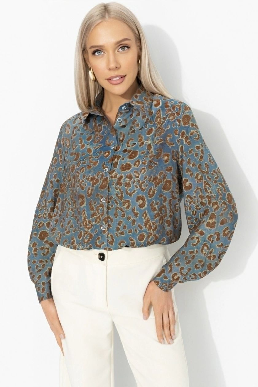 Рубашка синяя с леопардовым принтом от компании Charutti, выполнена из шёлка. Модель прямого силуэта, отложной воротник-стойка. Втачные длинные рукава на манжетах. Центральная застёжка. Идеальный выбор для Вашего стильного гардероба.